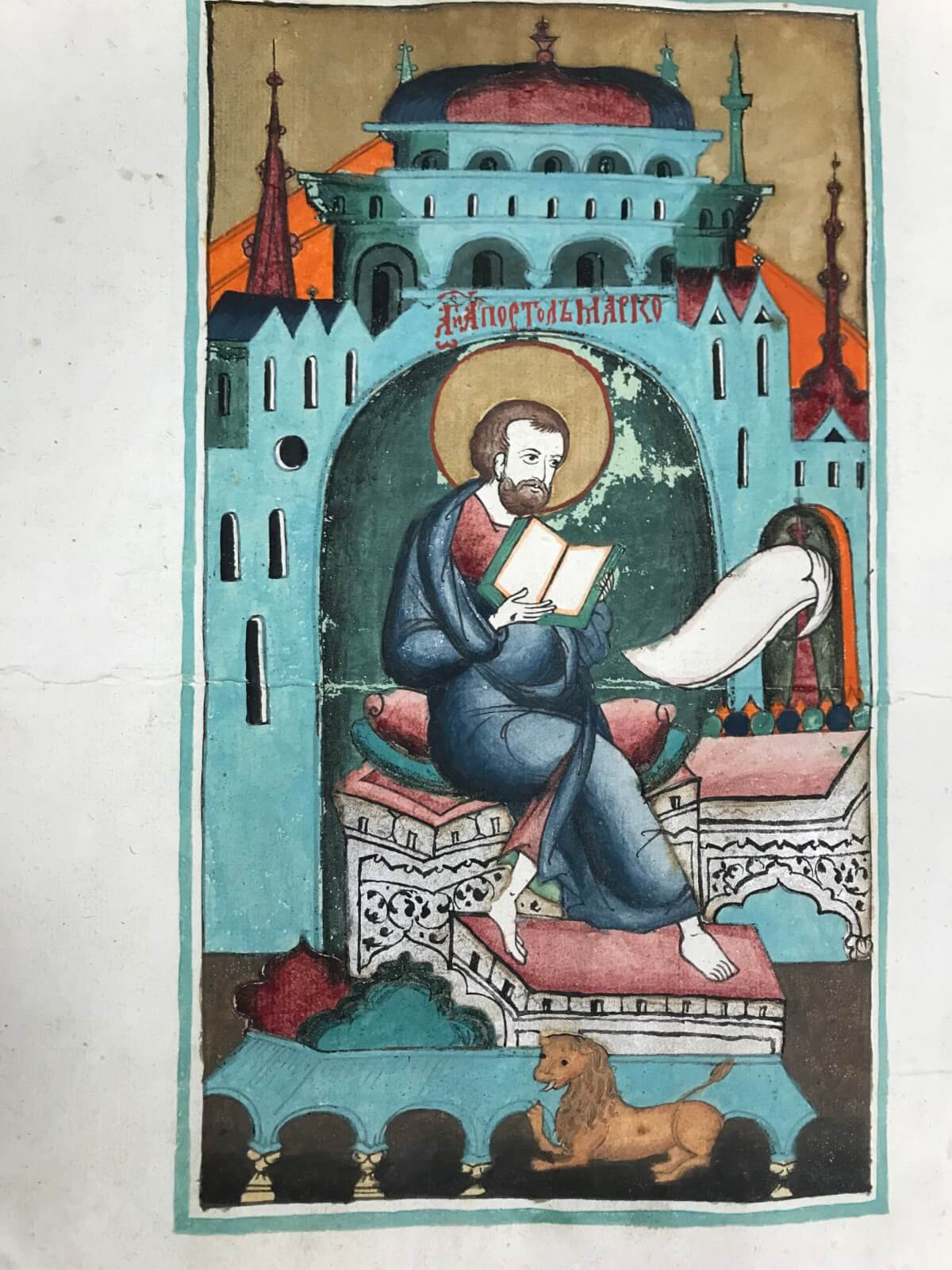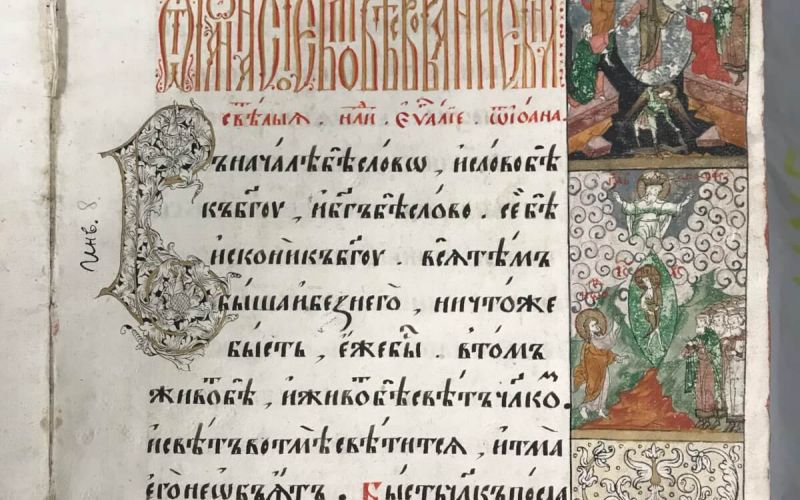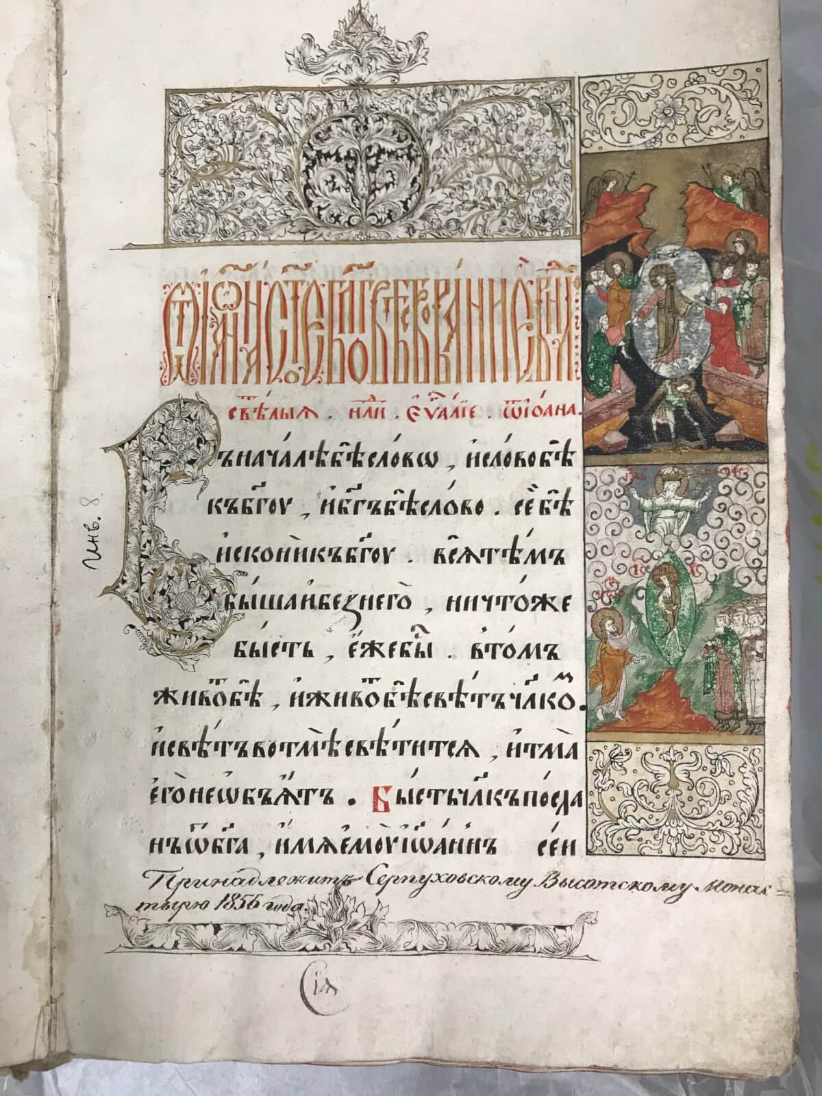 В постоянной экспозиции музея представлено Евангелие напрестольное — великолепный образец рукописной книги конца XVI — начала XVII в. Текст в книге украшают страничные изображения Евангелистов, заставки и миниатюры. Мастера использовали в работе темперу, киноварь и золочение. Евангелие напрестольное поступило в музей в 1931 году из Высоцкого мужского монастыря г. Серпухова и является одним из ранних в коллекции фонда редкой книги СИХМ.