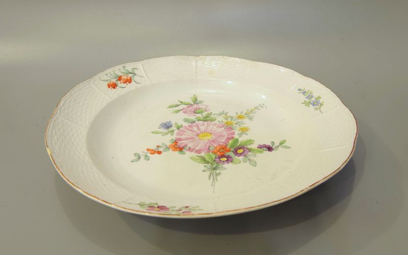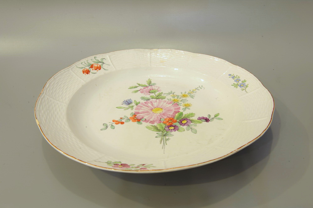 В XVIII в. сервизом называли не только специально выполненные комплекты столовой и чайной посуды, рассчитанные на определенное количество человек, но и разрозненную посуду, составленную в сервиз уже на столе. Примером может служить так называемый Вседневный сервиз. Он представлял собой, скорее, набор столовой посуды, которую использовали для повседневной сервировки стола царской семьи, в том числе и больших застолий. К нему относят тарелки, миски, блюда, террины, украшенные тисненым сетчатым или плетенным бордюром и однотипной росписью: в центре композиции изображен крупный букет цветов, вокруг него по белому фону разбросаны мелкие веточки с цветами. Предметы Вседневного сервиза исполнялись на Императорском фарфоровом заводе, на обороте имеют марку в виде екатерининского, павловского, александровского шифра и надпись «Придвор» или «ПК». В Серпуховском историко-художественном музее можно увидеть блюдо из этого сервиза, отмеченное на обороте вензелем Екатерины II.