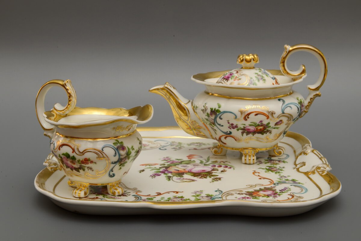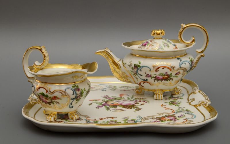 В 1830-1840-х гг. для русской культуры характерным становится камерность существования, жизнь больше для себя и для своих. И сервизы-дежене как нельзя лучше отвечали этому настроению, охватившему многие слои русского общества тех лет. В музее можно увидеть предметы сервиза «тет-а-тет», изготовленного на заводе А.Г. Попова в середине XIX в. в стиле второго рококо. Волнообразные формы, характерные для рококо, подчеркнуты позолотой и отлично гармонируют с тонко проработанной цветочной росписью, дополненной рокайльными мотивами; привлекают внимание такие детали, как ножки в виде волют, высокие изогнутые ручки, навершие крышки в виде раскрывшегося бутона, — всё это придает особую изысканность данному сервизу. Сейчас предметы этого сервиза: поднос, чайник и молочник, — представлены в Белом зале музея.