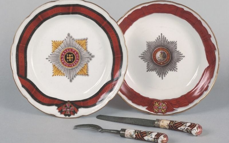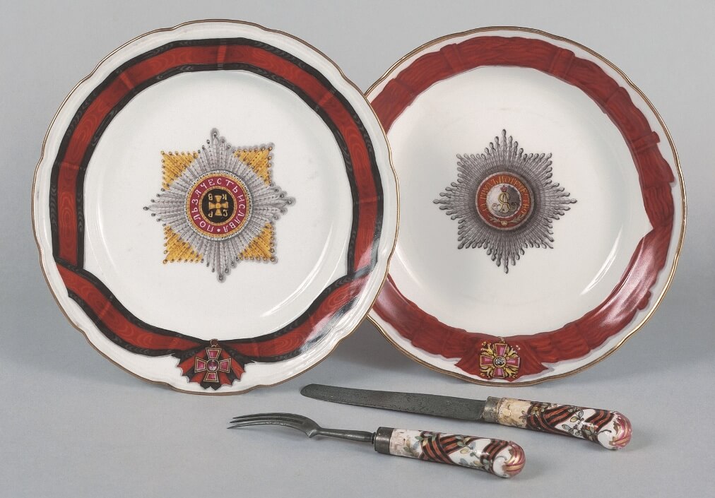 В Белом зале музея в витринах с русским фарфором представлены также предметы одних из самых знаменитых отечественных сервизов — тарелки Орденских сервизов.В 1777 г. по личному заказу императрицы Екатерины II на заводе Ф.Я. Гарднера приступили к изготовлению парадных сервизов для проводившихся ежегодно в Зимнем дворце торжественных приемов в честь кавалеров главных орденов России: Св. Великомученика и Победоносца Георгия; Св. Апостола Андрея Первозванного; Св. Благоверного князя Александра Невского; Св. Равноапостольного князя Владимира. Сервизы состояли от нескольких сотен до полутора тысяч предметов, разнообразных по функциональному назначению, размерам и формам. Исполнение этого ответственного заказа, продолжавшееся до 1785 г., принесло славу и авторитет заводу Гарднера — первому частному фарфоровому предприятию России.