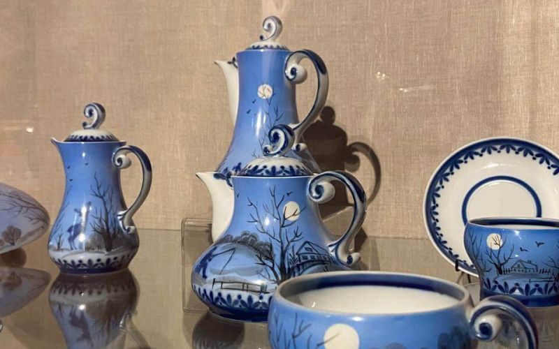 Зимние пейзажи Подмосковья с живописными лесными уголками, заснеженными деревенскими домиками и полями, зимними забавами и повседневными заботами вдохновили известного художника по фарфору Анну Ивановну Правикову (1919 — 1996) на создание чайно-кофейного сервиза с блюдом для завтрака «Подмосковные вечера», в котором объединены изящество формы, белизна фарфора и интересная роспись, тонко воспроизводящая атмосферу зимнего вечера.